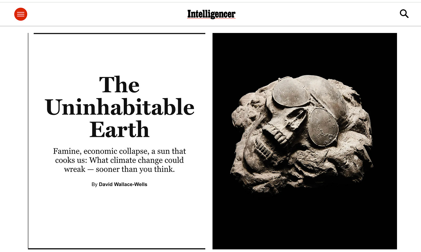 It grabbed my attention, and a lot of other people’s attention, too. The article is apparently the most-read in the magazine’s history. The gist was that the earth was—is—on track to become uninhabitable by humans in many regions much sooner than scientists once thought—or that just about anyone was willing to talk about or believe. Once I read this piece, those words lodged in my brain. It is, I promise, worse than you think.