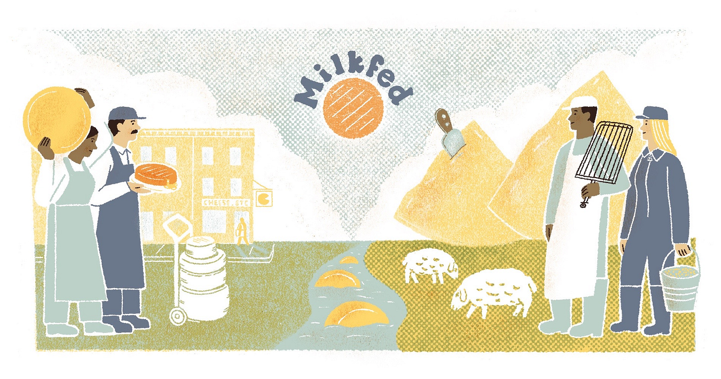 Milkfed: Notes on Cheese, Culture, and Climate is researched, written, and hosted by me, Alexandra Jones. It’s edited by Abby Cerquitella. I’m grateful for the support of the Daphne Zepos Teaching Endowment, which made my research and this podcast possible. You can learn more and donate to this amazing cheese education nonprofit at dzte.org. You can learn more about me at my website, alexandrajones.net, and subscribe to my newsletter—also covering cheese, culture, and climate—at milkfed.news. Thanks again for listening.
